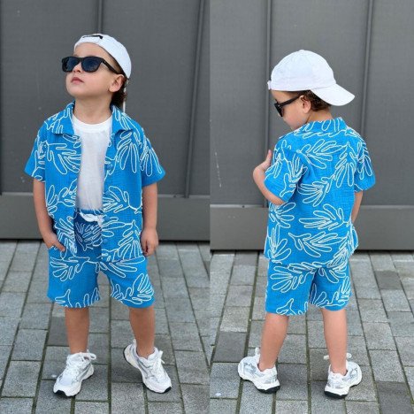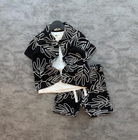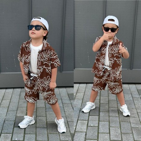 Ensemble 2 pièces composé d’une chemise manches courtes à motifs modernes et d’un short assorti pour un look streetwear chic.