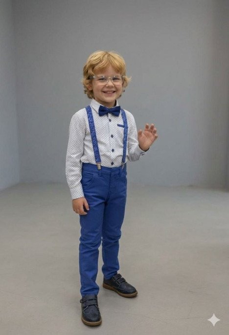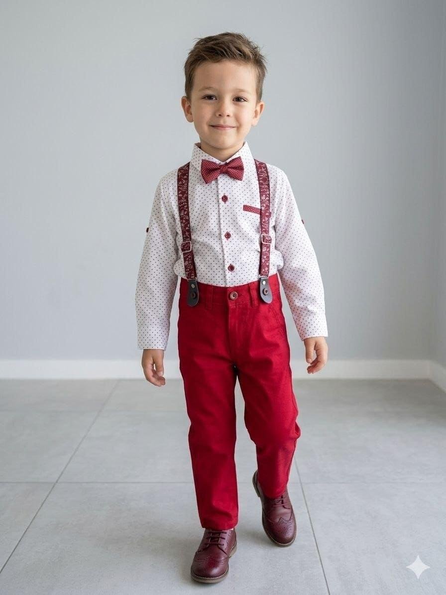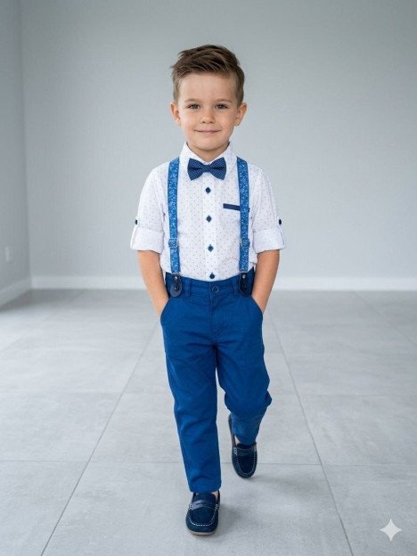 Inclut : chemise + nœud papillon + bretelles + pantalon + chaussures assorties.